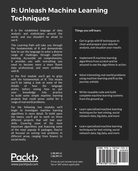 Find out how to build smarter machine learning systems with R. Follow this three module course to become a more fluent machine learning practitioner. Key Features:Build your confidence with R and find out how to solve a huge range of data-related problems Get to grips with some of the most important machine learning techniques being used by data scientists and analysts across industries today Don't just learn - apply your knowledge by following featured practical projects covering everything from financial modeling to social media analysis Book Description: R is the established language of data analysts and statisticians around the world. And you shouldn't be afraid to use it... This Learning Path will take you through the fundamentals of R and demonstrate how to use the language to solve a diverse range of challenges through machine learning. Accessible yet comprehensive, it provides you with everything you need to become more a more fluent data professional, and more confident with R. In the first module you'll get to grips with the fundamentals of R. This means you'll be taking a look at some of the details of how the language works, before seeing how to put your knowledge into practice to build some simple machine learning projects that could prove useful for a range of real world problems. For the following two modules we'll begin to investigate machine learning algorithms in more detail. To build upon the basics, you'll get to work on three different projects that will test your skills. Covering some of the most important algorithms and featuring some of the most popular R packages, they're all focused on solving real problems in different areas, ranging from finance to social media. This Learning Path has been curated from three Packt products: ¿ R Machine Learning By Example By Raghav Bali, Dipanjan Sarkar ¿ Machine Learning with R - Second Edition By Brett Lantz ¿ Mastering Machine Learning with R By Cory Lesmeister What You Will Learn:Get to grips with R techniques to clean and prepare your data for analysis, and visualize your results Implement R machine learning algorithms from scratch and be amazed to see the algorithms in action Solve interesting real-world problems using machine learning and R as the journey unfolds Write reusable code and build complete machine learning systems from the ground up Learn specialized machine learning techniques for text mining, social network data, big data, and more Discover the different types of machine learning models and learn which is best to meet your data needs and solve your analysis problems Evaluate and improve the performance of machine learning models Learn specialized machine learning techniques for text mining, social network data, big data, and more Who this book is for: Aimed for intermediate-to-advanced people (especially data scientist) who are already into the field of data science