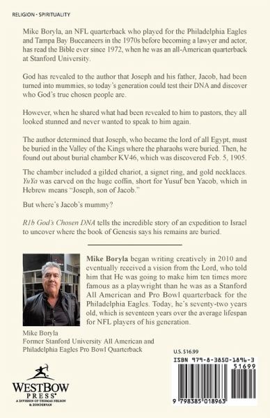Mike Boryla, an NFL quarterback who played for the Philadelphia Eagles and Tampa Bay Buccaneers in the 1970s before becoming a lawyer and actor, has read the Bible ever since 1972, when he was an all-American quarterback at Stanford University. God has revealed to the author that Joseph and his father, Jacob, had been turned into mummies, so today's generation could test their DNA and discover who God's true chosen people are. However, when he shared what had been revealed to him to pastors, they all looked stunned and never wanted to speak to him again. The author determined that Joseph, who became the lord of all Egypt, must be buried in the Valley of the Kings where the pharaohs were buried. Then, he found out about burial chamber KV46, which was discovered Feb. 5, 1905. The chamber included a gilded chariot, a signet ring, and gold necklaces. YuYa was carved on the huge coffin, short for Yusuf ben Yacob, which in Hebrew means "Joseph, son of Jacob." But where's Jacob's mummy? R1b God's Chosen DNA tells the incredible story of an expedition to Israel to uncover where the book of Genesis says his remains are buried.
