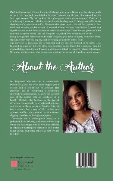 ""Raah just happened; it's raw from a girl's heart, who wrote. Being a seeker always made me go to the depths. I have failed a thousand times in my life, and of success, I feel the best is yet to come. My pain took me through a pause which was so essential. Pain can be so relieving, I witnessed all that surfaced while healing myself. Being vulnerable is like allowing one's mysterious self to blossom with grace, which has all the powers to heal itself and to paint our life canvas. It opened a door for new possibilities. I could view myself and the world from a space of ease and neutrality. These broken pieces of mine made me complete rather than the complete self, which was incomplete in itself! Being through this rollercoaster, I couldn't help but pen down in poetry form what I went through, which kept healing my soul, becoming an intricate part of mine. The universe is generous, life is beautiful, and we are just blessed to be here. I feel humbled to share my bit with all of you, beautiful souls. Pause for a moment, breathe, read with love. Even if a word makes a shift in you, I shall be honored to have helped you. No matter where we are, who we are, and what we do, we are all travelers, on our Raah....""