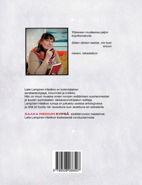 Runokokoelma RAAKA MEDIUM KYPSÄ on kollaasi elämästä, kuolemasta ja rakkaudesta niiden välissä. Väkevissä runoissa avautuu maailma, jota kirjoittaja zoomaa aistivoimaisten ja tarkkojen havaintojensa kautta. Teos on läpileikkaus kirjoittajan keskeisestä tuotannosta, jossa toisaalta runojen tarinallinen aistillisuus, toisaalta tiivis aforistisuus nivoutuvat vaivatta lähes elämäkerralliseksi muotokuvaksi. Syvälliset pohdinnat, yllättävät oivallukset ja lakoninen huumori ryydittävät lukijalle väylän samaistumiseen ja yhteiseen kokemiseen ihmiselon sattumanvaraisissa tuokioissa. Laila Lampinen-Hietikko on kokkolalainen sanataideohjaaja, kriitikko ja kolumnisti. RAAKA MEDIUM KYPSÄ on hänen esikoisteoksensa.