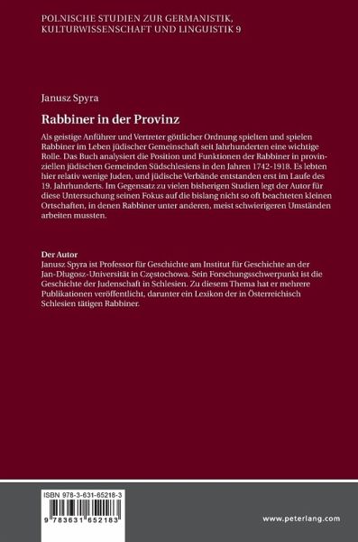 Als geistige Anführer und Vertreter göttlicher Ordnung spielten und spielen Rabbiner im Leben jüdischer Gemeinschaft seit Jahrhunderten eine wichtige Rolle. Das Buch analysiert die Position und Funktionen der Rabbiner in provinziellen jüdischen Gemeinden Südschlesiens in den Jahren 1742-1918. Es lebten hier relativ wenige Juden, und jüdische Verbände entstanden erst im Laufe des 19. Jahrhunderts. Im Gegensatz zu vielen bisherigen Studien legt der Autor für diese Untersuchung seinen Fokus auf die bislang nicht so oft beachteten kleinen Ortschaften, in denen Rabbiner unter anderen, meist schwierigeren Umständen arbeiten mussten.
