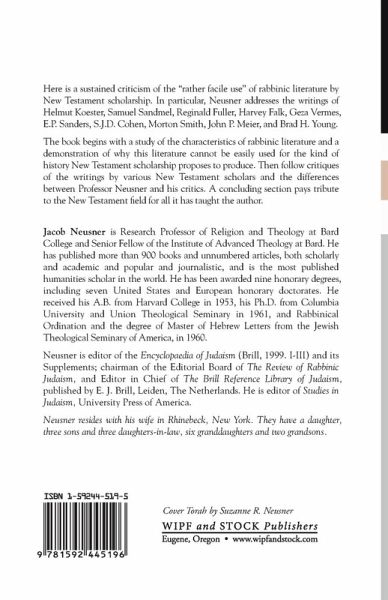 Here is a sustained criticism of the rather facile use of rabbinic literature by New Testament scholarship. In particular, Neusner addresses the writings of Helmut Koester, Samuel Sandmel, Reginald Fuller, Harvey Falk, Geza Vermes, E.P. Sanders, S.J.D. Cohen, Morton Smith, John P. Meier, and Brad H. Young. The book begins with a study of the characteristics of rabbinic literature and a demonstration of why this literature cannot be easily used for the kind of history New Testament scholarship proposes to produce. Then follow critiques of the writings by various New Testament scholars and the differences between Professor Neusner and his critics. A concluding section pays tribute to the New Testament field for all it has taught the author.