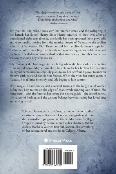 Ten-year-old Lily Nelson lives with her mother, sister, and the wellspring of her hatred: her father, Henry. Since Henry returned to their lives after an unexplained eight-year absence, the family has been uprooted, both physically and emotionally, moving from the mystical forests of Nakusp to the soulless suburbs of Vancouver, BC. There, an old but familiar darkness creeps into the household, unraveling their bonds and manifesting as rage, addiction, and madness. The darkness brings a shadow that attaches itself to Lily's mother-a shadow that only Lily seems to see. Lily discovers she has magic in her being when she hears whispers coming from an old book. Maybe now she'll be able to fix her broken life. Blaming Henry for her family's misery, Lily plans to use her newfound power to uncover Henry's dark past and banish him forever. When she visits her aunt's cabin in Nakusp, her abilities intensify, and Lily begins to lose control. With magic in Lily's bones, and ancestral trauma in the long line of women before her, Lily teeters on the edge of chaos while running out of time. She must learn-with the forest as her loving but neutral guide-the cost of hatred, the nature of healing, and the delicate balance between saving her loved ones and saving herself.