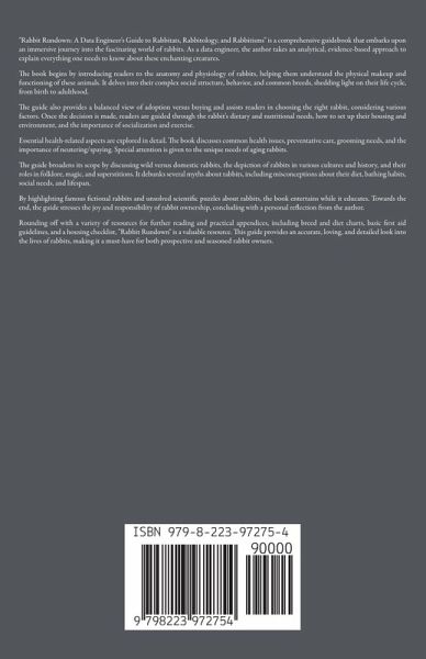 "Rabbit Rundown: A Data Engineer's Guide to Rabbitats, Rabbitology, and Rabbitisms" is a comprehensive guidebook that embarks upon an immersive journey into the fascinating world of rabbits. As a data engineer, the author takes an analytical, evidence-based approach to explain everything one needs to know about these enchanting creatures. The book begins by introducing readers to the anatomy and physiology of rabbits, helping them understand the physical makeup and functioning of these animals. It delves into their complex social structure, behavior, and common breeds, shedding light on their life cycle, from birth to adulthood. The guide also provides a balanced view of adoption versus buying and assists readers in choosing the right rabbit, considering various factors. Once the decision is made, readers are guided through the rabbit's dietary and nutritional needs, how to set up their housing and environment, and the importance of socialization and exercise. Essential health-related aspects are explored in detail. The book discusses common health issues, preventative care, grooming needs, and the importance of neutering/spaying. Special attention is given to the unique needs of aging rabbits. The guide broadens its scope by discussing wild versus domestic rabbits, the depiction of rabbits in various cultures and history, and their roles in folklore, magic, and superstitions. It debunks several myths about rabbits, including misconceptions about their diet, bathing habits, social needs, and lifespan. By highlighting famous fictional rabbits and unsolved scientific puzzles about rabbits, the book entertains while it educates. Towards the end, the guide stresses the joy and responsibility of rabbit ownership, concluding with a personal reflection from the author. Rounding off with a variety of resources for further reading and practical appendices, including breed and diet charts, basic first aid guidelines, and a housing checklist, "Rabbit Rundown" is a valuable resource. This guide provides an accurate, loving, and detailed look into the lives of rabbits, making it a must-have for both prospective and seasoned rabbit owners.