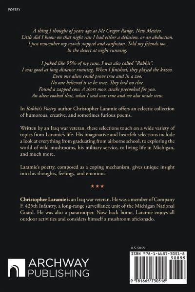 A thing I thought of years ago at Mc Gregor Range, New Mexico. Little did I know on that night run I had either a delusion, or an abduction. I just remember my watch stopped and confusion. Told my friends too. ln the desert at night running. I puked like 95% of my runs. I was also called "Rabbit". I was good at long distance running. When I finished, they played the kazoo. Even one alien could prove true and in a zoo. No one believed it to be true. They had no clue. Found a zapped cow. A short moo, steaks precooked for you. An alien cooked that, what I said was true and we also made stew. In Rabbit's Poetry, author Christopher Laramie offers an eclectic collection of humorous, creative, and sometimes furious poems. Written by an Iraq war veteran, these selections touch on a wide variety of topics from Laramie's life. His imaginative and heartfelt selections include a look at everything from graduating from airborne school, to exploring the world of wild mushrooms, his military service, to living life in Michigan, and much more. Laramie's poetry, composed as a coping mechanism, gives unique insight into his thoughts, feelings, and emotions.