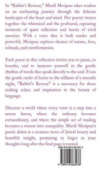 In "Rabbit's Retreat," Mirell Mesipuu takes readers on an enchanting journey through the delicate landscapes of the heart and mind. Her poetry weaves together the whimsical and the profound, capturing moments of quiet reflection and bursts of vivid emotion. With a voice that is both tender and powerful, Mesipuu explores themes of nature, love, solitude, and transformation. Each poem in this collection invites you to pause, to breathe, and to immerse yourself in the gentle rhythm of words that speak directly to the soul. From the gentle rustle of leaves to the stillness of a moonlit night, "Rabbit's Retreat" is a sanctuary for those seeking solace and inspiration in the beauty of language. Discover a world where every verse is a step into a serene haven, where the ordinary becomes extraordinary, and where the simple act of reading becomes a retreat into tranquility. Mirell Mesipuu's poetic debut is a treasure trove of lyrical beauty and heartfelt insight, promising to linger in your thoughts long after the final page is turned. Copyright (c) 2024 Swan Charm Publishing
