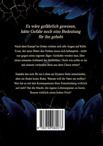 Es wäre gefährlich gewesen, hätte Gefahr noch eine Bedeutung für ihn gehabtNach dem Kampf im Orden richten sich alle Augen auf Köln. Fynn, der neue Hüter des Ordens muss sich behaupten - nicht nur gegen seine eigenen Jäger. Gerüchte werden laut, über einen erneuten Aufstand der Halbblüter. Doch wie sollte er sie mit seinem verletzten Bein aus dem Chaos retten?Siandra hat sich für ein Leben an Elyanos Seite entschieden, aber sie findet keine Ruhe. Warum will ihr Vater sie treffen? Was hat es mit den Konsequenzen ihrer Entscheidung wirklich auf sich? Hat die Macht, die eigene Lebensspanne zu beeinflussen wirklich einen hohen Preis?