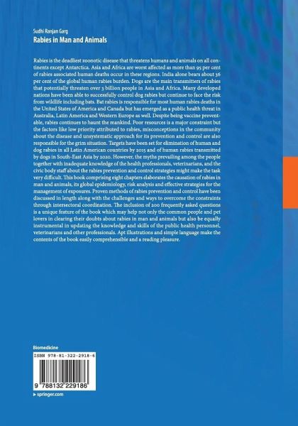 Rabies is the deadliest zoonotic disease that threatens humans and animals on all continents except Antarctica. Asia and Africa are worst affected as more than 95 per cent of rabies associated human deaths occur in these regions. India alone bears about 36 per cent of the global human rabies burden. Dogs are the main transmitters of rabies that potentially threaten over 3 billion people in Asia and Africa. Many developed nations have been able to successfully control dog rabies but continue to face the risk from wildlife including bats. Bat rabies is responsible for most human rabies deaths in the United States of America and Canada but has emerged as a public health threat in Australia, Latin America and Western Europe as well. Despite being vaccine preventable, rabies continues to haunt the mankind. Poor resources is a major constraint but the factors like low priority attributed to rabies, misconceptions in the community about the disease and unsystematic approach for its preventionand control are also responsible for the grim situation. Targets have been set for elimination of human and dog rabies in all Latin American countries by 2015 and of human rabies transmitted by dogs in South-East Asia by 2020. However, the myths prevailing among the people together with inadequate knowledge of the health professionals, veterinarians, and the civic body staff about the rabies prevention and control strategies might make the task very difficult. This book comprising eight chapters elaborates the causation of rabies in man and animals, its global epidemiology, risk analysis and effective strategies for the management of exposures. Proven methods of rabies prevention and control have been discussed in length along with the challenges and ways to overcome the constraints through intersectoral coordination. The inclusion of 200 frequently asked questions is a unique feature of the book which may help not only the common people and pet lovers in clearing their doubts about rabies in man and animals also be equally instrumental in updating the knowledge and skills of the public health personnel, veterinarians and other professionals. Apt illustrations and simple language make the contents of the book easily comprehensible and a reading pleasure.