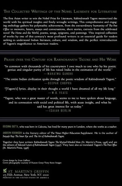 The first Asian writer to win the Nobel Prize for Literature, Rabindranath Tagore mesmerized the world with his spiritual insights and finely wrought writings. This comprehensive and engaging anthology gathers his polymathic achievement, from the extraordinary humanity of The Post Officer to memoirs, letters, essays and conversations, short stories, extracts from the celebrated novel The Home and the World, poems, songs, epigrams, and paintings. This inspired collection of works by one of this century's most profound writers in an essential guide for readers seeking to understand Indian literature, culture, and wisdom, and the perfect reintroduction of Tagore's magnificence to American readers.