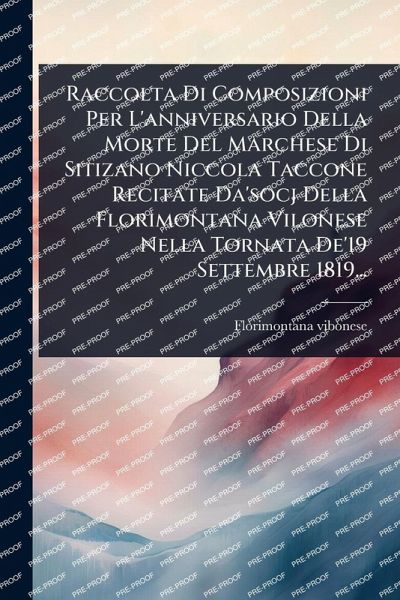 Raccolta Di Composizioni Per L'anniversario Della Morte Del Marchese Di Sitizano Niccola Taccone Recitate Da'socj Della Florimontana Vilonese Nella Tornata De'19 Settembre 1819... is a collection of literary works commemorating the Marquis Niccola Taccone of Sitizano. This volume preserves the compositions recited by the members of the Florimontana Vilonese society during their meeting on September 19, 1819, offering a glimpse into the cultural and literary traditions of early 19th-century Italy. The collection features poetic tributes and essays honoring the life and legacy of Marquis Taccone. This work provides valuable insight into the historical context and literary styles of the period, reflecting the societal values and commemorative practices prevalent at the time. It is a resource for scholars interested in Italian literature, local history, and the cultural heritage of the Vibo Valentia region. This work has been selected by scholars as being culturally important, and is part of the knowledge base of civilization as we know it. This work was reproduced from the original artifact, and remains as true to the original work as possible. Therefore, you will see the original copyright references, library stamps (as most of these works have been housed in our most important libraries around the world), and other notations in the work. This work is in the public domain in the United States of America, and possibly other nations. Within the United States, you may freely copy and distribute this work, as no entity (individual or corporate) has a copyright on the body of the work. As a reproduction of a historical artifact, this work may contain missing or blurred pages, poor pictures, errant marks, etc. Scholars believe, and we concur, that this work is important enough to be preserved, reproduced, and made generally available to the public. We appreciate your support of the preservation process, and thank you for being an important part of keeping this knowledge alive and relevant.