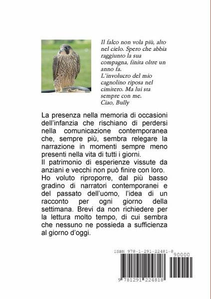 La presenza nella memoria di occasioni dell'infanzia che rischiano di perdersi nella comunicazione contemporanea che, sempre più, sembra relegare la narrazione in momenti sempre meno presenti nella vita di tutti i giorni. Il patrimonio di esperienze vissute da anziani e vecchi non può finire con loro. Ho voluto riproporre, dal più basso gradino di narratori contemporanei e del passato dell'uomo, l'idea di un racconto per ogni giorno della settimana. Brevi da non richiedere per la lettura molto tempo, di cui sembra che nessuno ne possieda a sufficienza al giorno d'oggi.