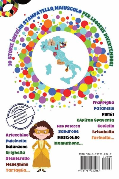 Racconti di Carnevale per Bambini - 30 Storie che uniscono tradizione e allegria Il volume è una raccolta di storie brevi, appositamente scritte in stampatello per facilitare le prime letture. Immergiti in avventure straordinarie con protagoniste le maschere di carnevale, che prendono vita in racconti di carnevale emozionanti e coinvolgenti. Ogni pagina è ricca di fantasia e pensata per stimolare l'immaginazione e l'amore per la lettura. Questo libro sul carnevale è un tesoro di storie per bambini che divertono, educano e ispirano.Cosa troverai all'interno:30 Storie brevi: ideali sia per le prime letture, sia come racconti della buonanotte. Cultura italiana: schede storiche su ogni maschera e regione, per scoprire insieme le radici culturali italiane. 30 Illustrazioni: colora le maschere del carnevale italiano. Alta leggibilità: testo in caratteri grandi e chiari, ideale come libro da leggere in stampatello. Formato compatto: facilmente trasportabile, ottimo per la lettura a casa, a scuola o in viaggio. Valori e divertimento: contenuti pensati per unire l'aspetto ludico a quello formativo con una morale per ogni storia. Contenuti aggiuntivi da scaricare
