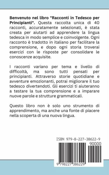 Benvenuto nel libro "Racconti in Tedesco per Principianti". Questa raccolta unica contiene 40 racconti selezionati con cura per aiutarti nell'apprendimento della lingua tedesca. Ogni racconto è tradotto in italiano, il che facilita la comprensione e il seguimento della storia. Inoltre, dopo ogni racconto, troverai esercizi con le risposte che ti aiuteranno a consolidare le conoscenze acquisite. I racconti presenti in questo libro variano per tema e livello di difficoltà, ma sono tutti adattati al livello principiante. Troverai storie di vita quotidiana, ma anche avventure più emozionanti. Ogni racconto è pensato per sviluppare la tua conoscenza della lingua tedesca in modo piacevole e coinvolgente. Gli esercizi che accompagnano ogni racconto sono progettati per verificare la tua comprensione del testo e aiutarti a imparare nuove parole e strutture grammaticali. Grazie a questi esercizi, potrai sviluppare le tue abilità linguistiche in modo sistematico. Spero che questo libro diventi per te non solo uno strumento di apprendimento, ma anche una fonte di piacere e soddisfazione nella scoperta di una nuova lingua. Viel Erfolg und viel Spaß beim Lesen!