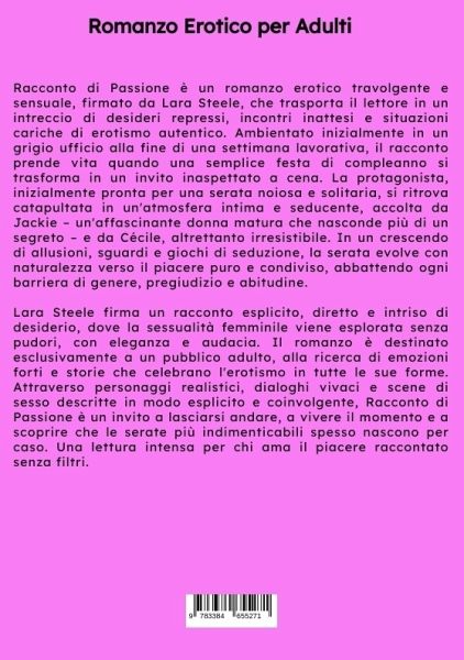 Racconto di Passione è un romanzo erotico travolgente e sensuale, firmato da Lara Steele, che trasporta il lettore in un intreccio di desideri repressi, incontri inattesi e situazioni cariche di erotismo autentico. Ambientato inizialmente in un grigio ufficio alla fine di una settimana lavorativa, il racconto prende vita quando una semplice festa di compleanno si trasforma in un invito inaspettato a cena. La protagonista, inizialmente pronta per una serata noiosa e solitaria, si ritrova catapultata in un'atmosfera intima e seducente, accolta da Jackie - un'affascinante donna matura che nasconde più di un segreto - e da Cécile, altrettanto irresistibile. In un crescendo di allusioni, sguardi e giochi di seduzione, la serata evolve con naturalezza verso il piacere puro e condiviso, abbattendo ogni barriera di genere, pregiudizio e abitudine.Lara Steele firma un racconto esplicito, diretto e intriso di desiderio, dove la sessualità femminile viene esplorata senza pudori, con eleganza e audacia. Il romanzo è destinato esclusivamente a un pubblico adulto, alla ricerca di emozioni forti e storie che celebrano l'erotismo in tutte le sue forme. Attraverso personaggi realistici, dialoghi vivaci e scene di sesso descritte in modo esplicito e coinvolgente, Racconto di Passione è un invito a lasciarsi andare, a vivere il momento e a scoprire che le serate più indimenticabili spesso nascono per caso. Una lettura intensa per chi ama il piacere raccontato senza filtri.