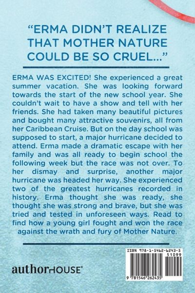 Erma didn't realize that Mother Nature could be so cruel. Erma was excited! She experienced a great summer vacation. She was looking forward to the start of the new school year. She couldn't wait to have a show-and-tell with her friends. She had taken many beautiful pictures and bought many attractive souvenirs, all from her Caribbean cruise. But on the day school was supposed to start, a major hurricane decided to attend. Erma made a dramatic escape with her family and was all ready to begin school the following week, but the race was not over. To her dismay and surprise, another major hurricane was headed her way. She experienced two of the greatest hurricanes recorded in history. Erma thought she was ready. She thought she was strong and brave, but she was tried and tested in unforeseen ways. Read to find how a young girl fought and won the race against the wrath and fury of Mother Nature.