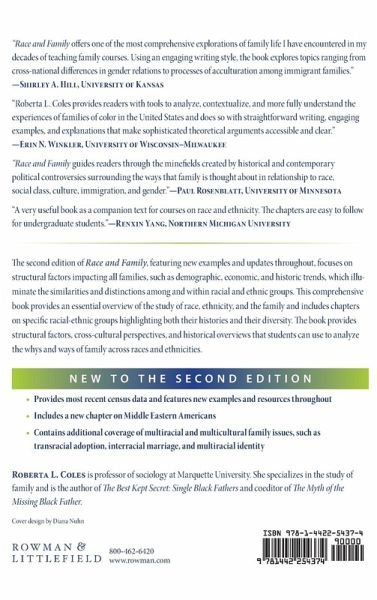 Brief Table of Contents 1. Introduction Overview of the Text Discussion of Key Concepts Resources 2. Approaching the Study of Race and Family Economic Factors Demographic Factors Historical-Legal Factors Resources 3. A Brief History of the American Family American Families through the Centuries Resources 4. Cross-Cultural Comparisons Social or Legal Marriage Marriage Types and Choices Marriage as a Family Affair Family Power Systems Family Functions Resources 5. Family Structures Prevalence of Family Structure from the Child's Perspective Pathways to Single Parenthood Advantages and Disadvantages of Family Structures Extended Family Households Nonfamily Households Resources 6. Gender Relations and Sex Ratios Gender Construction and Socialization Sex Ratios African American Gender Issues Native American Gender Issues Latina/o Gender Issues Asian American Gender Issues Domestic Violence Resources 7. Intergenerational Relationships: Parent and Child Individual and Communal Orientations Effects of Socioeconomic Status on Children's Well-Being Racial Socialization Resources 8 Intergenerational Relationships in Late Life: The Elderly, Their Adult Children, and Their Grandchildren Intergenerational Interaction Caregiving for the Ill Elderly Illness and Death Death Resources 9. African American Families How Did Slavery Shape Black American Families? African American Families after Slavery African American Families Today Resources 10. Native American Families Looking Back in History The State of American Indian Families Today Resources 11. Latino American Families Manner and Timing of Entry Effects of History and Immigration on Socioeconomic Status Familism and Cultural Commonalities Divergent Family Trends among Latino Ethnic Groups Resources 12. Asian American Families East Asians in America Southeast Asians in America Asian American Families Today Resources 13. Middle Eastern American Families Religions in the Middle East Their Immigration History Current Demographics and Family Life Resources 14. Acculturation and Multiracial Family Issues Acculturation Multiracial Issues Resources