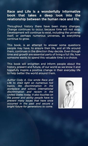 Hello my name is Cody Alan Cox and I just published "RACE AND LIFE" the book. It is all about the relationship and connection between race and life. Racism is not right and should never be used to harm an innocent person.