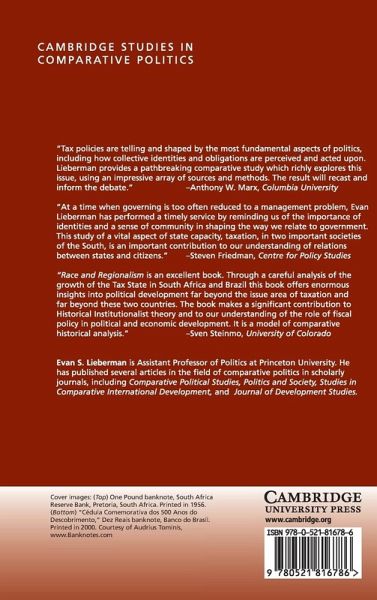 Evan Lieberman's analysis focuses on the politics of taxation as a way of understanding the development of governments. He compares Brazil and South Africa because of their similarities: They are upper-middle-income countries, and highly unequal--both in terms of income and racial status. Lieberman argues that different constitutional approaches to race (whether or not to grant equal citizenship to blacks) and federalism (whether to have it or not) shaped the organization of politics in the two countries, leading to the development of very different tax systems. The findings are based on extensive field research, large-scale national surveys, macroeconomic data, and various archival and secondary sources.