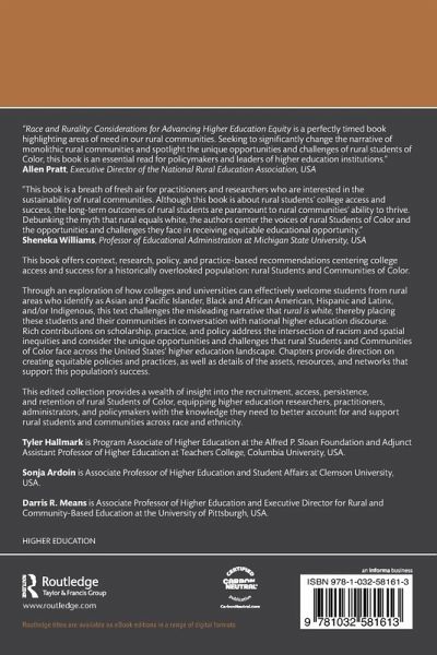 This book offers context, research, policy, and practice-based recommendations centering college access and success for a historically overlooked population: rural Students and Communities of Color.