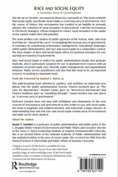 In this compelling book the author contends that social equity--specifically racial equity--is a nervous area of government. Over the course of history, this nervousness has stifled many individuals and organizations, thus leading to an inability to seriously advance the reduction of racial inequities in government. The author asserts that until this nervousness is effectively managed, public administration social equity efforts designed to reduce racial inequities cannot realize their full potential.