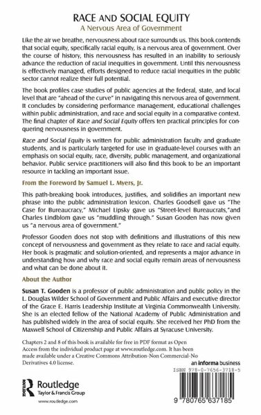 In this compelling book the author contends that social equity--specifically racial equity--is a nervous area of government. Over the course of history, this nervousness has stifled many individuals and organizations, thus leading to an inability to seriously advance the reduction of racial inequities in government.