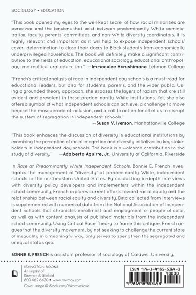 In this book, French compares the "well-meaning" intensions of "diversity" in independent schools with the continued dominance of whiteness in these institutions. Using mixed methods and a Critical Race Theory frame, French argues that "diversity" serves only to strengthen the status quo of educational segregation between Black and White.