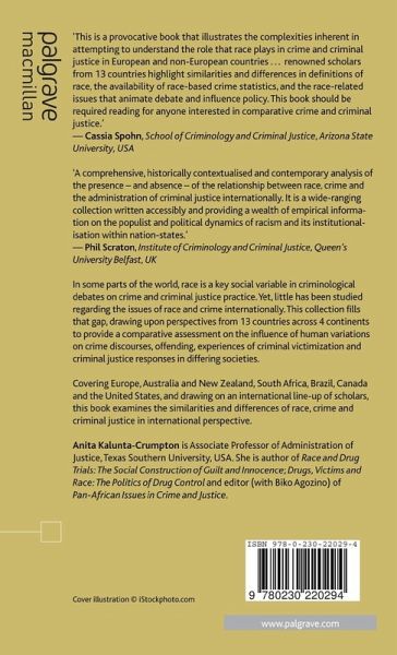 'This is a provocative book that illustrates the complexities inherent in attempting to understand the role that race plays in crime and criminal justice in European and non-European countries renowned scholars from 13 countries highlight similarities and differences in definitions of race, the availability of race-based crime statistics, and the race-related issues that animate debate and influence policy. This book should be required reading for anyone interested in comparative crime and criminal justice.'
