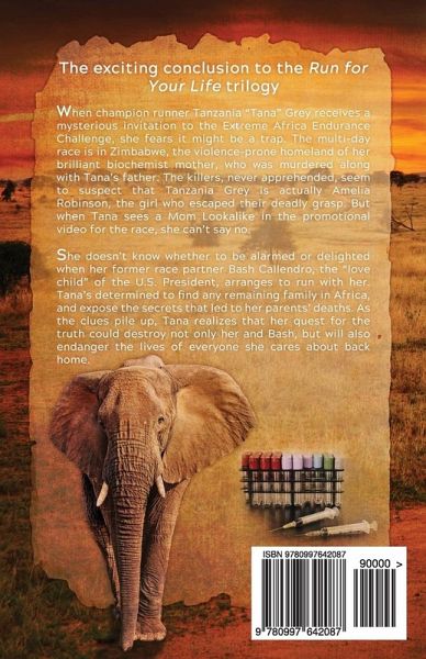 The exciting conclusion to the Run for Your Life trilogy ~ When champion runner Tanzania "Tana" Grey receives a mysterious invitation to the Extreme Africa Endurance Challenge, she fears it might be a trap. The multi-day race is in Zimbabwe, the violence-prone homeland of her brilliant biochemist mother, who was murdered along with Tana's father. The killers, never apprehended, seem to suspect that Tanzania Grey is actually Amelia Robinson, the girl who escaped their deadly grasp. But when Tana sees a Mom Lookalike in the promotional video for the race, she can't say no.