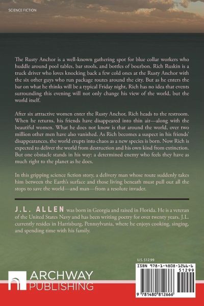 The Rusty Anchor is a well-known gathering spot for blue collar workers who huddle around pool tables, bar stools, and bottles of bourbon. Rich Ruskin is a truck driver who loves knocking back a few cold ones at the Rusty Anchor with the six other guys who run package routes around the city. But as he enters the bar on what he thinks will be a typical Friday night, Rich has no idea that events surrounding this evening will not only change his view of the world, but the world itself. After six attractive women enter the Rusty Anchor, Rich heads to the restroom. When he returns, his friends have disappeared into thin air-along with the beautiful women. What he does not know is that around the world, over two million other men have also vanished. As Rich becomes a suspect in his friends' disappearances, the world erupts into chaos as a new species is born. Now Rich is expected to deliver the world from destruction and his own kind from extinction. But one obstacle stands in his way: a determined enemy who feels they have as much right to the planet as he does. In this gripping science fiction story, a delivery man whose route suddenly takes him between the Earth's surface and those living beneath must pull out all the stops to save the world-and man-from a resolute invader.