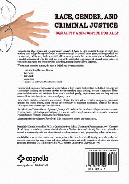 The anthology Race, Gender, and Criminal Justice: Equality & Justice for All?, examines the ways in which race, ethnicity, class, and gender impact offenders as they move through the criminal justice system, and integrate back into the community. While many books in the field address race or gender in the criminal justice system, this book offers a detailed exploration of both. The book also looks at the unintended consequences of criminal justice policies on women and minorities, and considers what, if anything, is being done to address disparities. Written in an accessible manner, the book is divided into five main sections: - Understanding Race and Gender - The Police - The Courts - Corrections - Issues of Re-entry and Disenfranchisement The individual chapters of the book cover topics that are of high interest to students in the fields of Sociology and Criminology, including the difference between race and ethnicity, racial profiling, the role of specialized courts, prosecutorial discretion, and recidivism. Issues such as the death penalty, imprisonment rates, and drug policy are examined from both domestic and international perspectives. Each chapter includes information on accessing relevant YouTube videos, websites, non-profits, government agencies, and journal articles, giving students the opportunity for additional examination. There are also critical thinking questions to encourage class discussions. Race, Gender, and Criminal Justice: Equality & Justice for All? can be used in both lower and upper-division courses in Criminal Justice, Criminology, and Sociology. It is also an excellent supplementary text for courses in the areas of Political Science, Women's Studies, and Race/Black Studies. Adopting professors will receive PowerPoint slides to assist with lectures and test questions. Danielle McDonald received her Ph.D. in Criminology from Indiana University of Pennsylvania in 2006. Currently, Dr. McDonald is an assistant professor of criminal justice at Northern Kentucky University. She teaches and conducts research in the areas of gender and crime, alternatives to incarceration, re-entry programming and service learning. Alexis Miller is an associate professor of criminal justice at Northern Kentucky University, where she teaches and conducts research in the areas of race and crime, college students and faculty perceptions of crime, and criminal justice and the media. Dr. Miller received her Ph.D. from the University of Louisville, in 1999.
