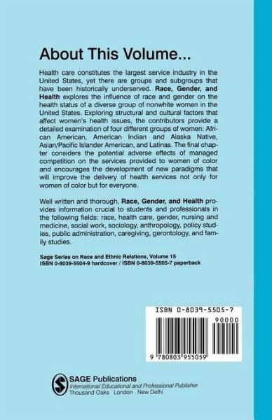 The influence of race and gender on the health status of nonwhite women in the United States is the theme of this book. Four distinct groups of women are examined closely: African Americans; American Indians and Alaskan Natives; Asian/Pacific Islander Americans; and Latinas. Contributors focus in particular on structural and cultural factors which affect women's health issues. The concluding chapter calls for the development of new paradigms to improve the delivery of health care for these women and for the US population as a whole.