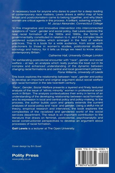 This book explores the relationship between 'race', gender and policy to develop an important and original argument about social welfare and racial formation in the late twentieth century. The book presents a layered and finely textured analysis of the issue of 'ethnic minority' women in professional social work in Britain. The analysis contextualizes their entry in terms of an understanding of the developing relationship between racial formation and its expression in local and central policy and policy-making. In the process, the author builds upon and greatly extends the current analyses of social policy and 'race' and gender. Using a skilful mix of theory, empirical research and interviews, the book explores the complexities of the racialized and gendered world of the social services department. The result is an important contribution to the literature that draws on feminist, postcolonial, psychoanalytic and social constructionist perspectives to develop an argument about processes of racial formation. 'Race', Gender, Social Welfare will be of interest to students, academics and practitioners in the fields of social welfare, social work, ethnic and women's studies and discourse analysis.