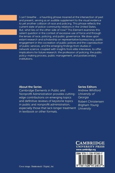 I can't breathe ... a haunting phrase which reflects the current state of police-community relations in the United States. But, what lies on the other side of now? This Element examines this salient question in the context of excessive use of force and through the lenses of race, policing and public governance.