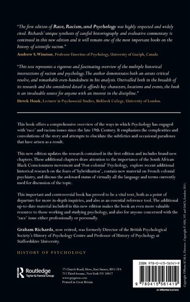 Introduction 1. The Pre-evolutionary Background and the Roots of Scientific Racism 2. Psychology and 'Scientific Racism' 1860-1910 3. An Imperial Interlude: The Cambridge Torres Straits Expedition and its Aftermath 4. 'Race' in US Psychology to 1945: I. The Rise and Nature of 'Race Psychology' 5. 'Race' in US Psychology to 1945: II. The rise of anti-racism 6. 'Race' in European Psychology to 1940: I. Primitive Minds and Aryan Supermen 7. 'Race' in European Psychology to 1940: II. Its Presence and Absence in British Psychology 8. 'Race' in British Psychology 1945-c. 1970: A Brief Note 9. Racism at Bay: Psychology and 'race' 1945-69 10. Race and IQ 1969-2010: Still An Undead Controversy? 11. A Changed Landscape 12. Liberation Psychology 13. Historiographical Updates and New Thoughts 14. Resumé