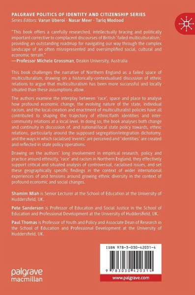 The authors examine the interplay between 'race', space and place to analyse how profound economic change, the evolving nature of the state, individual racism, and the local creation and enactment of multiculturalist policies have all contributed to shaping the trajectory of ethnic/faith identities and inter-community relations at a local level. In doing so, the book analyses both change and continuity in discussion of, and national/local state policy towards, ethnic relations, particularly around the supposed segregation/integration dichotomy, and the ways in which racialised 'events' are perceived and 'identities' are created and reflected in state policy operations.