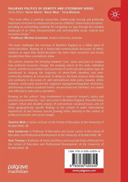 The authors examine the interplay between 'race', space and place to analyse how profound economic change, the evolving nature of the state, individual racism, and the local creation and enactment of multiculturalist policies have all contributed to shaping the trajectory of ethnic/faith identities and inter-community relations at a local level. In doing so, the book analyses both change and continuity in discussion of, and national/local state policy towards, ethnic relations, particularly around the supposed segregation/integration dichotomy, and the ways in which racialised 'events' are perceived and 'identities' are created and reflected in state policy operations.
