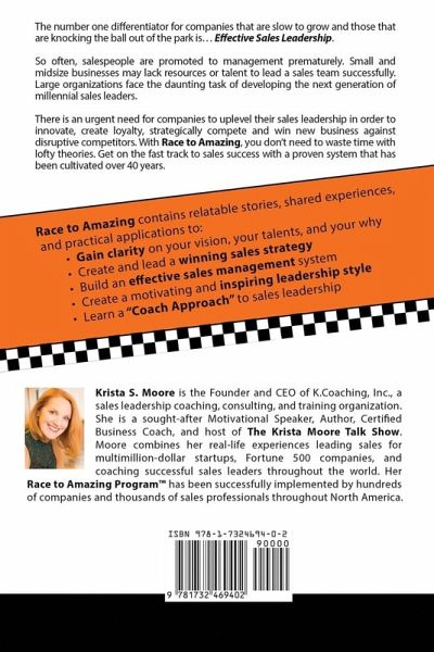 The number one differentiator for companies that are slow to grow and those that are knocking the ball out of the park is… Effective Sales Leadership. So often, salespeople are promoted to management prematurely, without the skills and experience to be an effective sales leader. Small and midsize business owners wear multiple hats and may lack resources or talent to lead a sales team successfully. Large organizations face the daunting task of developing the next generation of millennial sales leaders. There is an urgent need for companies to uplevel their sales leadership in order to innovate, continue to create customer loyalty, strategically compete in global economies, and win new business against disruptive competitors. There is good news! With Race to Amazing, you don’t need to waste time with lofty theories. Get on the fast track to sales success with a proven system that has been cultivated over 40 years. Author Krista S. Moore has codified her winning approach through combining her personal experiences growing up in a small coal-mining town, leading sales for multimillion-dollar startups and Fortune 500 companies, and coaching successful sales leaders throughout the world. Learn through her relatable stories, shared experiences, and practical applications of how other sales leaders have struggled, yet quickly created a winning system and style. Race to Amazing contains all the tools you need to achieve success: • Gain clarity on your vision, your talents, and your why • Create and lead a winning sales strategy • Build an effective sales management system • Create a motivating and inspiring leadership style • Learn a "Coach Approach" to sales leadership Race to Amazing will inspire you to be the best that you can be, have a positive impact on others, and get the business results you are looking for.