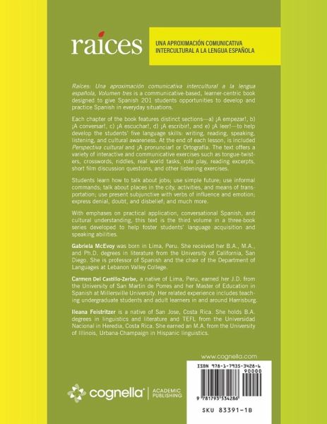 Raíces: Una aproximación comunicativa intercultural a la lengua española, Volumen tres is a communicative-based, learner-centric book designed to give Spanish 201 students opportunities to develop and practice Spanish in everyday situations. Each chapter of the book features distinct sections-a) ¡A empezar!, b) ¡A conversar!, c) ¡A escuchar!, d) ¡A escribir!, and e) ¡A leer!-to help develop the students' five language skills: writing, reading, speaking, listening, and cultural awareness. At the end of each lesson, is included Perspectiva cultural and ¡A pronunciar! or Ortografía. The text offers a variety of interactive and communicative exercises such as tongue-twisters, crosswords, riddles, real world tasks, role play, reading excerpts, short film discussion questions, and other listening exercises. Students learn how to talk about jobs; use simple future; use informal commands; talk about places in the city, activities, and means of transportation; use present subjunctive with verbs of influence and emotion; express denial, doubt, and disbelief; and much more. With emphases on practical application, conversational Spanish, and cultural understanding, this text is the third volume in a three-book series developed to help foster students' language acquisition and speaking abilities.