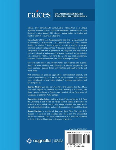 Raíces: Una aproximación comunicativa intercultural a la lengua española, Volumen dos is a communicative-based, learner-centric book designed to give Spanish 102 students opportunities to develop and practice Spanish in everyday situations. Each chapter of the book features distinct sections-a) ¡A empezar!, b) ¡A conversar!, c) ¡A escuchar!, d) ¡A escribir!, and e) ¡A leer!- to help develop the students' five language skills: writing, reading, speaking, listening, and cultural awareness. At the end of each lesson, is included Perspectiva cultural and ¡A pronunciar! or Ortografía. The text offers a variety of interactive and communicative exercises such as tongue-twisters, crosswords, riddles, real world tasks, role play, reading excerpts, short film discussion questions, and other listening exercises. Students learn how to use reflexive verbs, comparatives, and superlatives; talk about clothing and shopping; use present progressive; talk about local and Hispanic dishes; use indefinite and negative words; and much more. With emphases on practical application, conversational Spanish, and cultural understanding, this text is the second volume in a three-book series developed to help foster students' language acquisition and speaking ability.