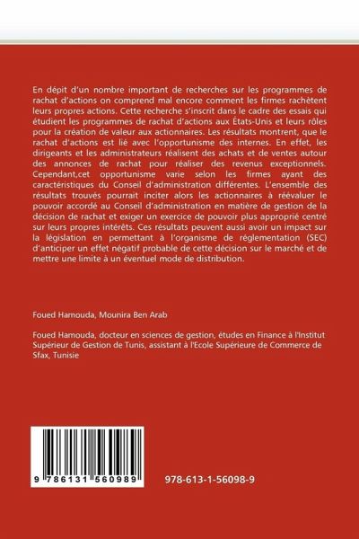 En dépit d'un nombre important de recherches sur les programmes de rachat d'actions on comprend mal encore comment les firmes rachètent leurs propres actions. Cette recherche s'inscrit dans le cadre des essais qui étudient les programmes de rachat d'actions aux États-Unis et leurs rôles pour la création de valeur aux actionnaires. Les résultats montrent, que le rachat d'actions est lié avec l'opportunisme des internes. En effet, les dirigeants et les administrateurs réalisent des achats et de ventes autour des annonces de rachat pour réaliser des revenus exceptionnels. Cependant,cet opportunisme varie selon les firmes ayant des caractéristiques du Conseil d'administration différentes. L'ensemble des résultats trouvés pourrait inciter alors les actionnaires à réévaluer le pouvoir accordé au Conseil d'administration en matière de gestion de la décision de rachat et exiger un exercice de pouvoir plus approprié centré sur leurs propres intérêts. Ces résultats peuvent aussi avoir un impact sur la législation en permettant à l'organisme de réglementation (SEC) d'anticiper un effet négatif probable de cette décision sur le marché et de mettre une limite à un éventuel mode de distribution.