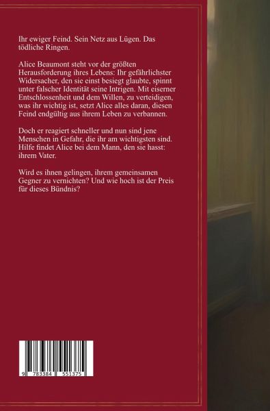 Ihr ewiger Feind. Sein Netz aus Lügen. Das tödliche Ringen.Alice Beaumont steht vor der größten Herausforderung ihres Lebens: Ihr gefährlichster Widersacher, den sie einst besiegt glaubte, spinnt unter falscher Identität seine Intrigen. Mit eiserner Entschlossenheit und dem Willen, zu verteidigen, was ihr wichtig ist, setzt Alice alles daran, diesen Feind endgültig aus ihrem Leben zu verbannen.Doch er reagiert schneller und nun sind jene Menschen in Gefahr, die ihr am wichtigsten sind. Hilfe findet Alice bei dem Mann, den sie hasst: ihrem Vater.Wird es ihnen gelingen, ihrem gemeinsamen Gegner zu vernichten? Und wie hoch ist der Preis für dieses Bündnis?
