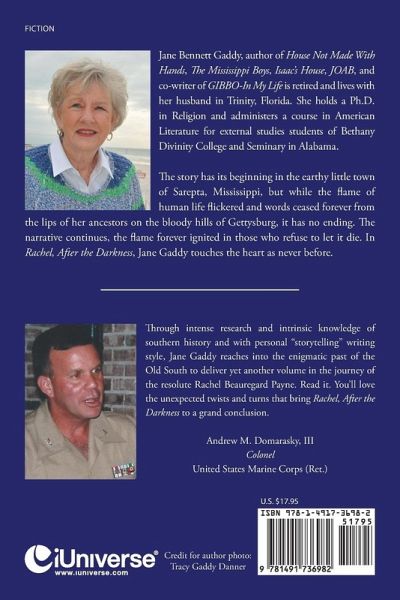 Rachel, After the Darkness is a continuation of the struggle in which Jane Gaddy intricately describes the South following the war and during the reunification of a broken Nation. Rachel?s husband and son are gone, having fallen at Gettysburg. Three sons have married, and Rachel and her youngest, Samuel, are left alone to run the small farm in northeast Mississippi. The darkness represents a time that never should have been, and in her thoughts, Rachel relives the gloom of death and destruction; the disparities of Federal intervention during Reconstruction and the re-establishing of the Old South; and the harsh restrictions of the Radical Regime. As the story progresses, Rachel receives a short-term offer to become an editorial writer for a major newspaper in New York City where she momentarily lives the Gilded Age, observes the abject poverty of Irish immigrants, and endures the sporadic and sometimes violent opposition to her southern-view editorials. She experiences love in great measure and the eventual return home where awaits unexpected news and heartache, and finally happiness and contentment once again. With characters out of the playbook of times gone by and personal ?storytelling? writing style, Dr. Gaddy has created a memorable journey from the darkness of war and its aftermath to the light of a better time.