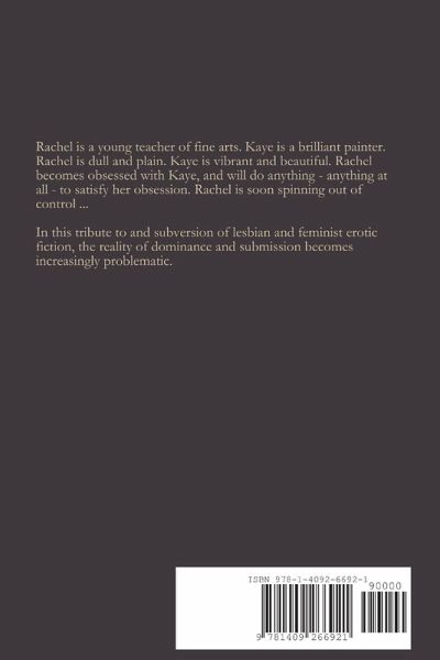 Rachel is a young teacher of fine arts. Kaye is a brilliant painter. Rachel is dull, plain and overweight. Kaye is vibrant and beautiful. Rachel becomes obsessed with Kaye and will do anything - anything at all - to satisfy her obsession. Rachel is soon spinning out of control ... In this tribute to and subversion of lesbian and feminist erotic fiction, the dynamics of dominance and submission become increasingly problematic. At last - the erotic classic that was effectively banned in Australia is now in print.