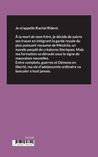 Je m'appelle Rachel Rident.À la mort de mon frère, je décide de suivre ses traces en intégrant la garde royale du plus puissant royaume de Mécénia, un monde peuplé de créatures féeriques. Mais ma formation se déroule sous le signe de mauvaises nouvelles.Entre complots, guerres et Démons en liberté, ma vie d'adolescente ordinaire va basculer à tout jamais.