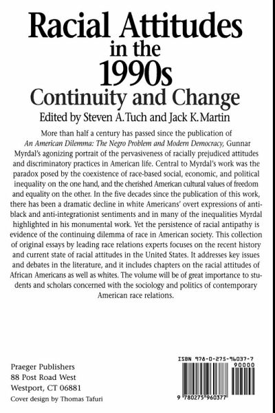 More than half a century has passed since the publication of An American Dilemma: The Negro Problem and Modern Democracy, Gunnar Myrdal's agonizing portrait of the pervasiveness of racially prejudiced attitudes and discriminatory practices in American life. Central to Myrdal's work was the paradox posed by the coexistence of race-based social, economic, and political inequality on the one hand, and the cherished American cultural values of freedom and equality on the other. In the five decades since the publication of this work, there has been a dramatic decline in white Americans' overt expressions of anti-black and anti-integrationist sentiments and in many of the inequalities Myrdal highlighted in his monumental work. Yet the persistence of racial antipathy is evidence of the continuing dilemma of race in American society. This collection of original essays by leading race relations experts focuses on the recent history and current state of racial attitudes in the United States. It addresses key issues and debates in the literature, and it includes chapters on the racial attitudes of African-Americans as well as whites. The volume will be of great importance to students and scholars concerned with the sociology and politics of contemporary American race relations.