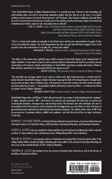 Racial Battle Fatigue is described as the physical and psychological toll taken due to constant and unceasing discrimination, microagressions, and stereotype threat. The literature notes that individuals who work in environments with chronic exposure to discrimination and microaggressions are more likely to suffer from forms of generalized anxiety manifested by both physical and emotional syptoms. This edited volume looks at RBF from the perspectives of graduate students, middle level academics, and chief diversity officers at major institutions of learning. RBF takes up William A. Smith's idea and extends it as a means of understanding how the "academy" or higher education operates. Through microagressions, stereotype threat, underfunding and defunding of initiatives/offices, expansive commitments to diversity related strategic plans with restrictive power and action, and departmental climates of exclusivity and inequity; diversity workers (faculty, staff, and administration of color along with white allies in like positions) find themselves in a badlands where identity difference is used to promote institutional values while at the same time creating unimaginable work spaces for these workers.