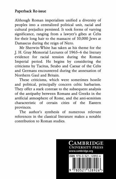 Although Roman Imperialism unified a diversity of peoples into a centralised political unit, racial and cultural prejudice persisted. It took forms of varying significance, ranging from a lawyer's gibes at Celts for their long hair to the massacre of 10,000 Jews at Damascus during the reign of Nero. Sherwin-White has taken as his theme the literary evidence for racial tension during the Roman Imperial period. He begins by considering the criticisms by Tacitus, Strabo and Caesar of the Celts and Germans encountered during the annexation of Northern Gaul and Britain. These criticisms, which were sometimes hostile and political, principally concern celtic barbarism. They offer a stark contrast to the subsequent analysis of the antipathy between Romans and Greeks in the artificial atmosphere of Rome, and the anti-semitism characteristic of certain cities of the Eastern provinces. The author's synthesis of numerous relevant references in the classical literature makes a notable contribution to Roman studies.