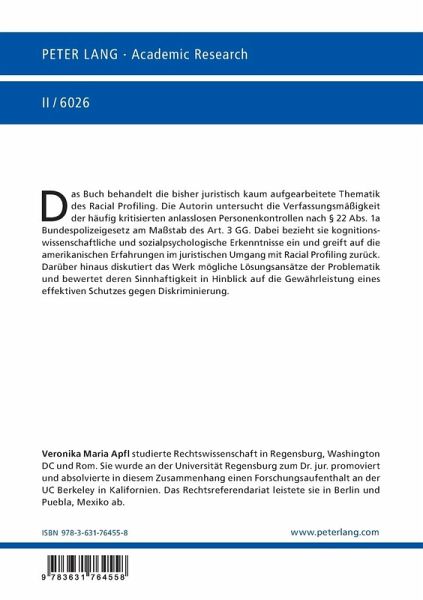 Das Buch behandelt die bisher juristisch kaum aufgearbeitete Thematik des Racial Profiling. Die Autorin untersucht die Verfassungsmäßigkeit der häufig kritisierten anlasslosen Personenkontrollen nach § 22 Abs. 1a Bundespolizeigesetz am Maßstab des Art. 3 GG. Dabei bezieht sie kognitionswissenschaftliche und sozialpsychologische Erkenntnisse ein und greift auf die amerikanischen Erfahrungen im juristischen Umgang mit Racial Profiling zurück. Darüber hinaus diskutiert das Werk mögliche Lösungsansätze der Problematik und bewertet deren Sinnhaftigkeit in Hinblick auf die Gewährleistung eines effektiven Schutzes gegen Diskriminierung.