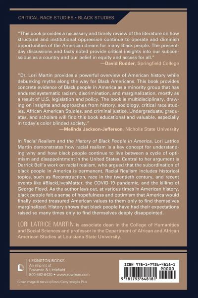 In Racial Realism and the History of Black People in America, Lori Latrice Martin demonstrates how racial realism is a key concept for understanding why and how black people continue to live between a cycle of optimism and disappointment in the United States. Central to her argument is Derrick Bell's work on racial realism, who argued that the subordination of black people in America is permanent. Racial Realism includes historical topics, such as Reconstruction, race in the 20th century, and recent events like #BlackLivesMatter, the COVID-19 pandemic, and the killing of George Floyd. As the author lays out, at various times in American history, black people felt a sense of hopefulness and optimism that America would finally extend treasured American values to them only to find themselves marginalized. History shows that black people have had their expectations raised so many times only to find themselves deeply disappointed.