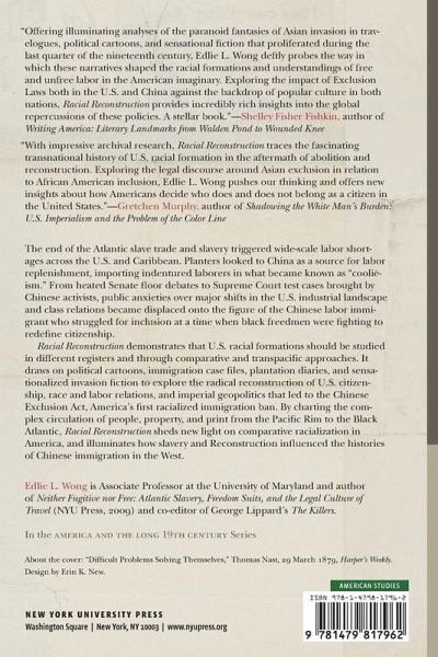 The end of slavery and the Atlantic slave trade triggered wide-scale labor shortages across the U.S. and Caribbean. Planters looked to China as a source for labor replenishment, importing indentured laborers in what became known as "coolieism." From heated Senate floor debates to Supreme Court test cases brought by Chinese activists, public anxieties over major shifts in the U.S. industrial landscape and class relations became displaced onto the figure of the Chinese labor immigrant who struggled for inclusion at a time when black freedmen were fighting to redefine citizenship. Racial Reconstruction demonstrates that U.S. racial formations should be studied in different registers and through comparative and transpacific approaches. It draws on political cartoons, immigration case files, plantation diaries, and sensationalized invasion fiction to explore the radical reconstruction of U.S. citizenship, race and labor relations, and imperial geopolitics that led to the Chinese Exclusion Act, America's first racialized immigration ban. By charting the complex circulation of people, property, and print from the Pacific Rim to the Black Atlantic, Racial Reconstruction sheds new light on comparative racialization in America, and illuminates how slavery and Reconstruction influenced the histories of Chinese immigration to the West.